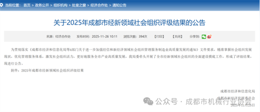 成都市机械行业协会获评2025年成都市经新领域社会组织评级A级