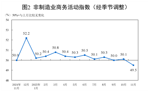 11月份,非制造业商务活动指数为49.5%,比上月下降0.6个百分点。